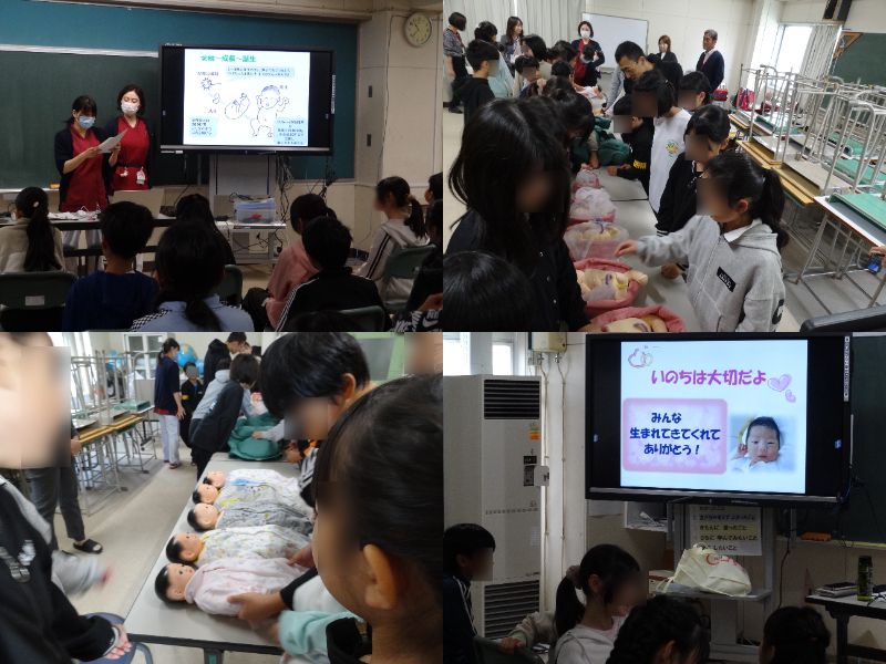 16日に助産師の方に来校いただき、5年生の保健の学習で「いのちの始まり」について学習を行いました。受精についての紙芝居や妊婦疑似エプロンでの体験、エコーでの赤ちゃんの顔の様子、赤ちゃんの心音、赤ちゃんの人形の抱っこなど、たくさんのことを学ばせていただきました。当日は、保護者の方にも参観いただき、わが子が生まれた時の感動も含め、命の大切さを学ぶ機会となりました。