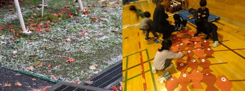 今日7日は、朝から肌寒く雪も予報されていました。その通り雪も降りだす時間もあり、児童玄関前は、うっすら雪景色が見られました。子どもたちにとっては、うれしい雪なんだと思います。外は寒くとも、校内は暖かく、体育館の片隅では自分たちの劇で使う道具を作っている様子が見られました。