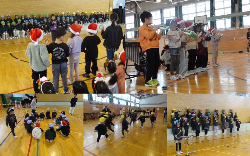 12月11日、1年生は、大麻まんまるこども園の年長さんを招待して、クリスマス交流会を行いました。1年生のみんなは、どうしたら年長さんたちが喜んでくれるのかを考え合い、たくさんの出し物やプレゼントを準備し、当日元気いっぱい披露しました。年長さんからもお返しとして、とってもすてきなベル演奏を聴かせてもらいました。