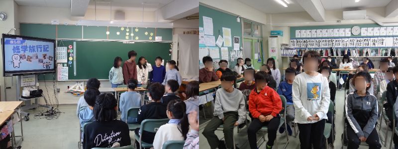 12月22日、6年生が5年生を教室に招いて、来年の修学旅行がある5年生に、プレゼンを行ってくれました。6年生の子どもたちがタブレットで作成したスライドを使って、修学旅行の行き先や食べたもの、注意すること等々を楽しいクイズ形式で紹介していました。きっと5年生のみんなは、今から来年の修学旅行が楽しみになったことと思います。