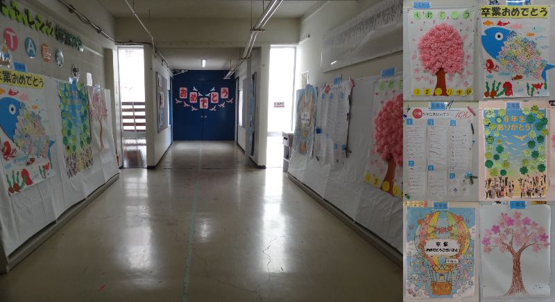 体育館前の廊下を歩くと、各学年の子どもたちが心を込めて作ったお祝いメッセージが目に飛び込んできます。一つ一つの言葉に、6年生への憧れと感謝が溢れており、校内は6年生の卒業をお祝いする温かな気持ちに包まれています。この扉の向こうは、いよいよ卒業式のステージです。もうすぐ卒業式!