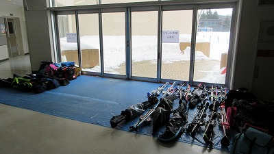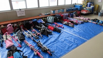 また、来週からはいよいよ築山でのスキー学習がスタートする予定です。スキー学習に向けた用具の準備や持ち込みにご協力いただき、誠にありがとうございます。 校内の廊下には、来週からの学習を待つスキー用具が整然と並んでいます。