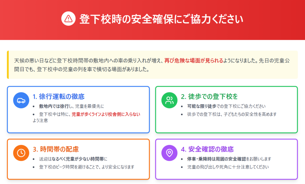 保護者のみなさまへお願い(登下校時の安全確保) 投稿日時: 2025年10月31日 投稿者: bunkyoudai-syou 最近、天候の悪い日などに登下校時間帯の敷地内への車の乗り入れが増え、児童にとって危険な場面が見られるようになりました。子どもたちの安全を守るため、以下の4点についてご協力をお願いいたします。 Post Views: 11