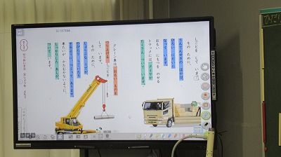 この単元では、クレーン車やトラックなど、様々な自動車の「仕事」や「つくり」について、説明文を読み取る学習をしています。