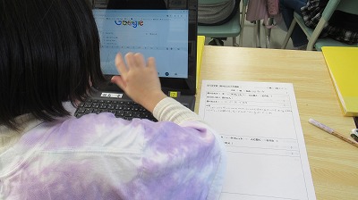 図書室の本だけでなく、インターネットを使って情報を集める学習を行っています。