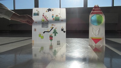 透明な板と色鮮やかなセロハンを使い、光を通した時の美しさを味わう作品を作りました。 見る角度や光の強さによって表情を変える様子は、幻想的な光のアートのようです!