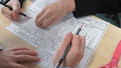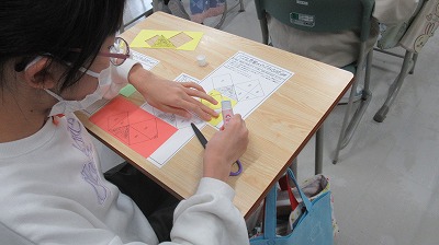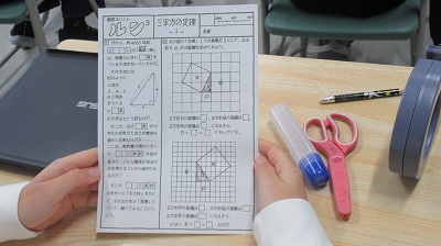 今回は大麻中学校から数学科の先生にお越しいただきました 。 授業のテーマは、なんと「三平方の定理」です 。本来は中学3年生で習う難しい内容ですが、今回はハサミやのりを使って、図形を切り貼りしながら法則を見つけ出す、パズルのような楽しい授業を行っていただきました。