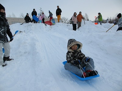 努力の結晶である特設コースを、一気に滑り降りる快感! 子どもたちの弾ける歓声と最高の笑顔が、その楽しさを証明しています。