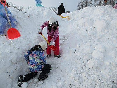 作業が始まると、保護者の皆様や学年を問わず子どもたちが自然に声を掛け合い、寒さを忘れて力いっぱいスコップを動かす姿がとても印象的でした。みんなで協力して雪を積み上げ、一段ずつ丁寧に固めながら、巨大な滑り台を手作業で形にしていきました。