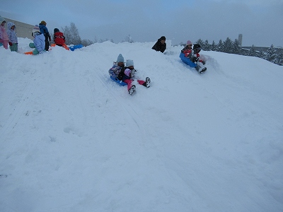 雪山では、そり滑りに挑戦です。「いくよー!」という合図とともに、勢いよく滑り降りる子どもたち。最初は少し怖がっていた子も、一度滑ればコツを掴んだようで、何度も何度も山を駆け上がっては滑る楽しさを味わっていました。