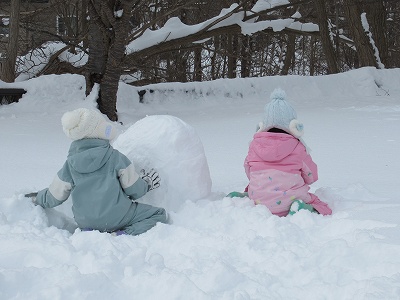 広場では、あちこちで雪玉を転がす姿が見られました。 「重たくなってきた!」「こっち手伝って!」と声を掛け合いながら、小さな雪玉を一生懸命大きくしていきます。自分たちの背丈に届きそうな大きな雪玉が出来上がると、あちこちで歓声が上がっていました。