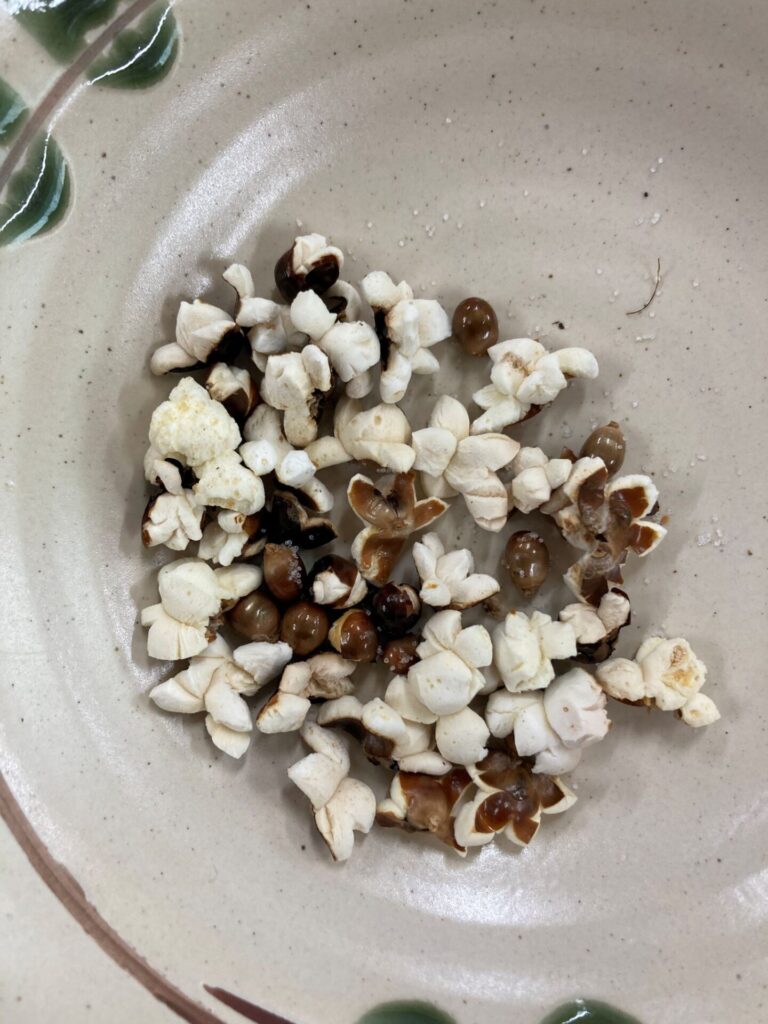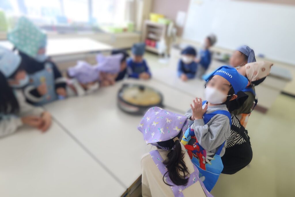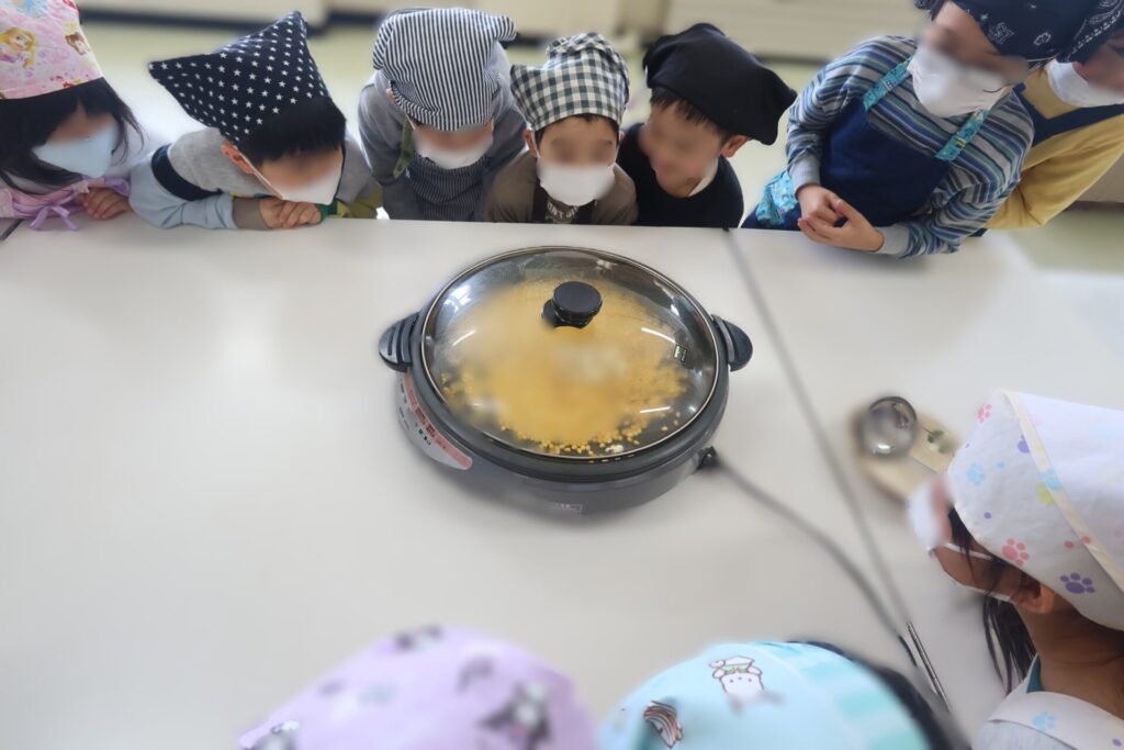 生活科の学習で夏に収穫したコーンを生かして、ポップコーンづくりに挑戦しました。ポップコーンが出来上がっていくようすを、みんなで顔を寄せ合いながら見ている様子はとてもかわいらしかったです。1年生からもおすそ分けをいただきましたが、とてもおいしかったです。