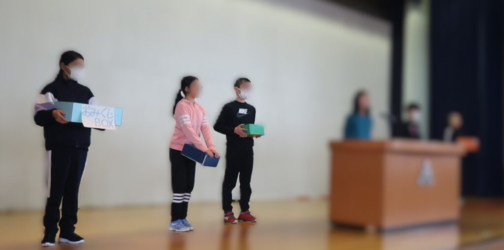 本日12月25日(木)で後期前半が終了しました。朝の時間に「冬休み前集会」が行われました。児童代表として3年生児童がリコーダーや跳び箱をがんばったことについて堂々と発表してくれました。また児童会書記局児童2名が、冬休みの生活リズムを整えることの大切さなどをわかりやすく発表してくれました。