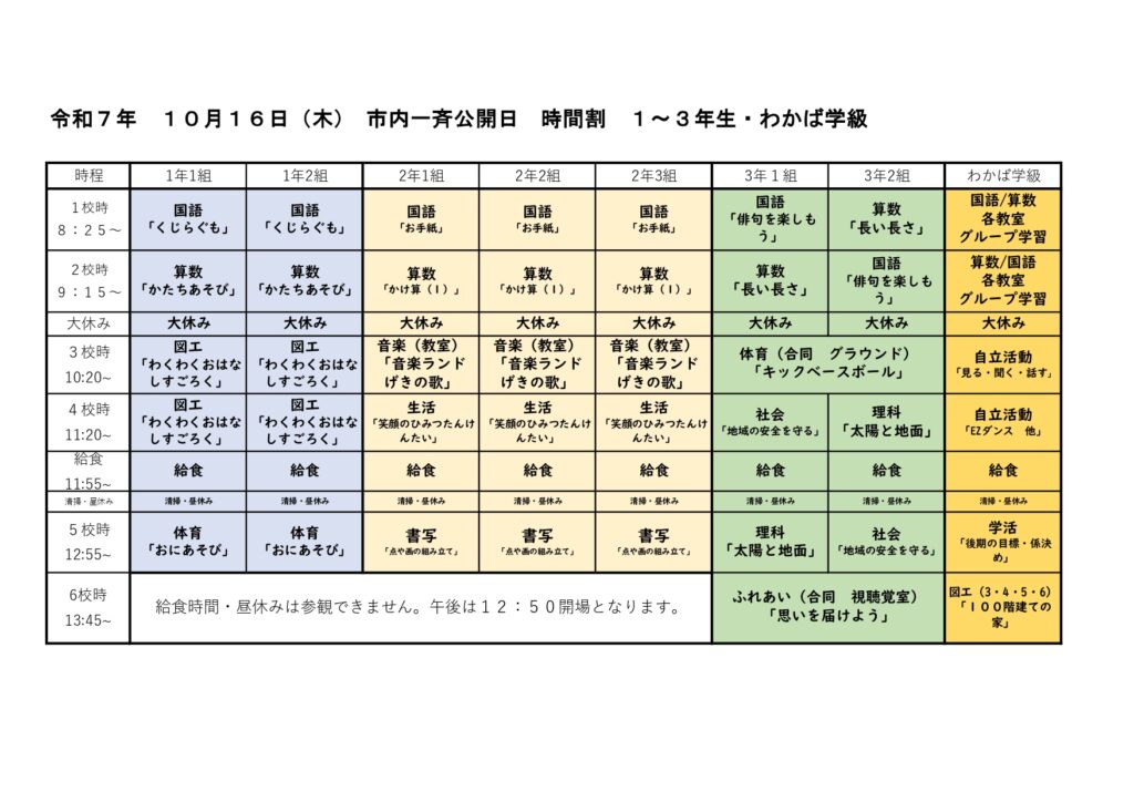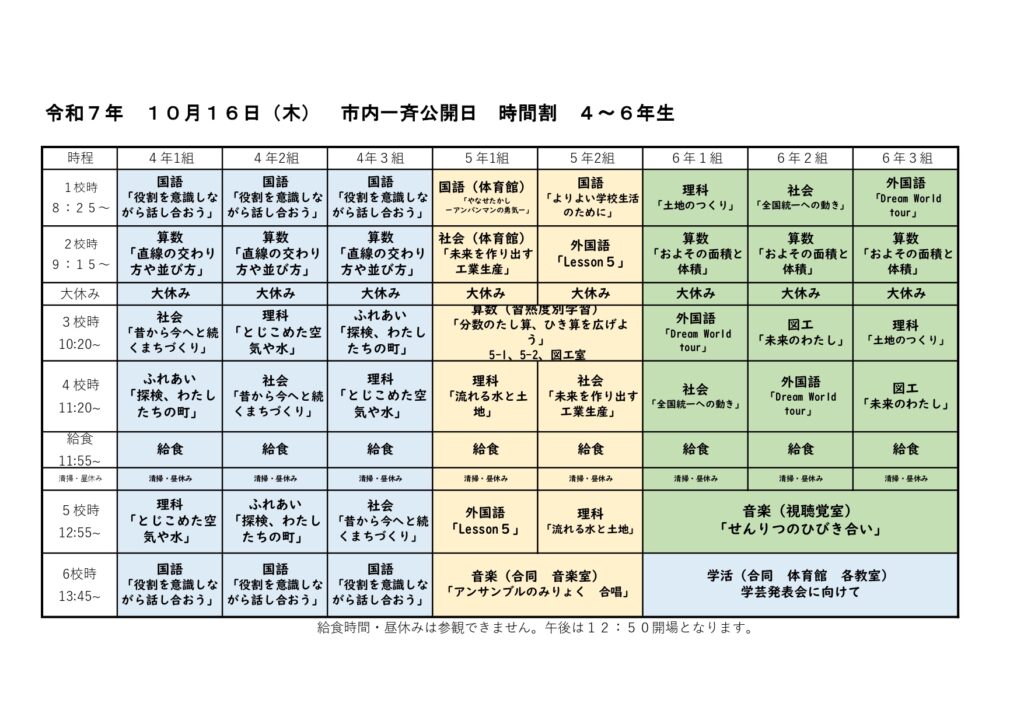 10月16日(木)は、市内学校一斉公開日です。どなたでも参観可能ですので、お時間のある方はぜひお越しください。公開時間は午前9時から午後2時30分までです。なお、給食時間(11:55~12:35)の来校はお控え願います。
