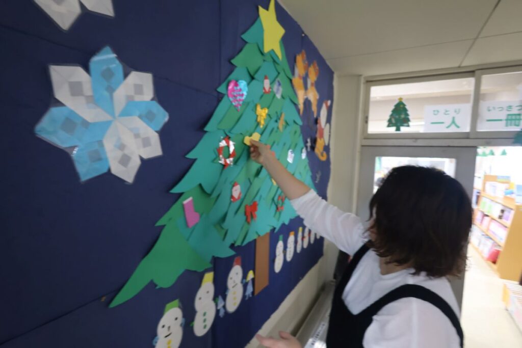 本日もみぞれまじりの天気となり、冬の訪れを少しずつ感じさせる毎日が続いています。そんな中、図書館装飾グループの皆さんが来校し、活動していただきました。クリスマスの飾りつけをテーマに、図書館の雰囲気もがらりと変わりました。皆様ありがとうございました。