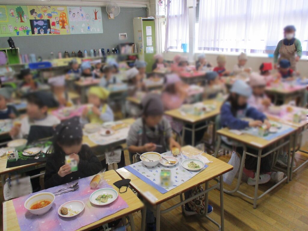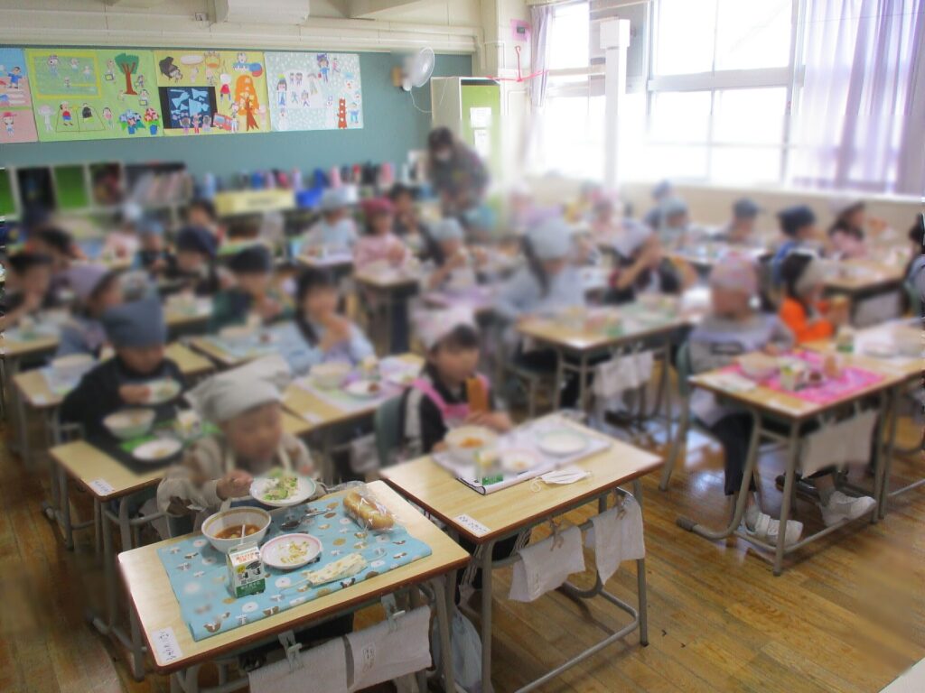 1年生にとって、小学校では初めての給食の時間がきました!子どもたちは、この日をとても楽しみにしていたようで、準備から張り切っていました!準備ができたら、いよいよ「いただきます!」1年生は、「給食、おいしい♪」と言って、うれしそうに食べていました!