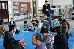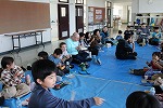 青空ランチは、暖かければグラウンドの芝生で実施する予定でしたが、当日は気温が低かったため、2階ホールに場所を変更し、全校児童と教職員、保護者と一緒にお弁当を食べました。