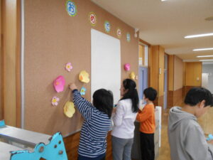 1年生の教室へ新しい教科書を運んだり、机の上にプリントをきれいに並べたりと、心を込めて準備を進めました。また、廊下には可愛らしい装飾も飾り付けられました。