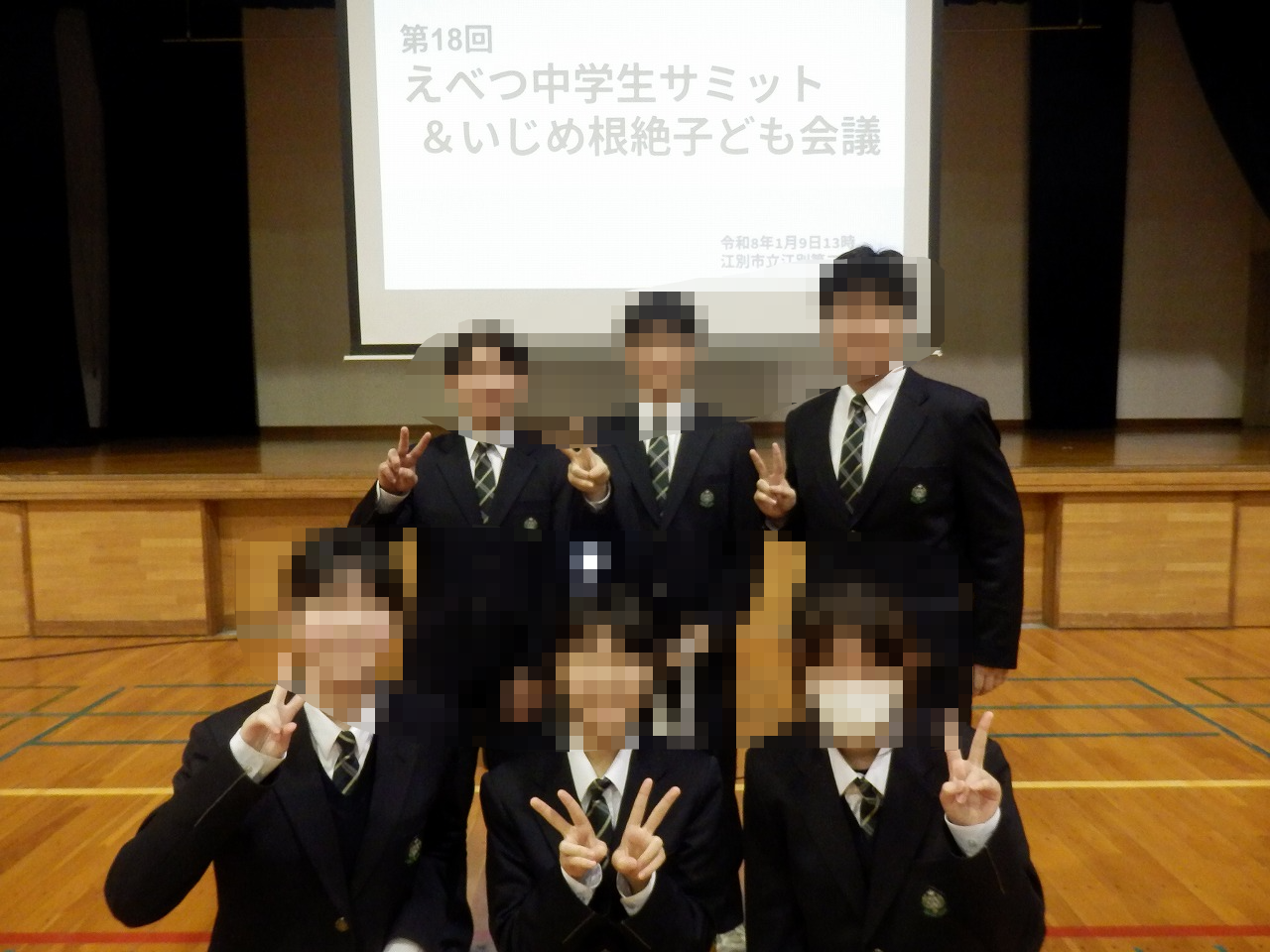 1月9日、えべつ中学生サミット&いじめ根絶子ども会議に本校の生徒会役員たちが参加してきました。市内の生徒会役員たちが一堂に会し、各校の生徒会活動の紹介やいじめ撲滅に向けての取り組み方や、スマホ利用にかかわる江別スマート4ルールについて、話し合いが行われました。