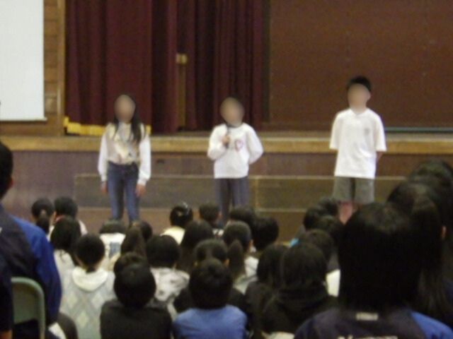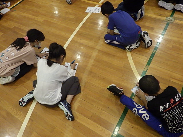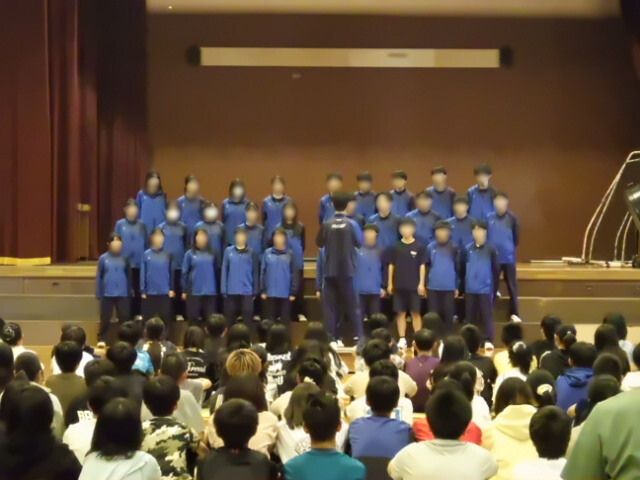 ①のモザイクアートでは、各自担当の色が決まっているので、自分の担当の色を塗り終えたら、別の色を担当している子に渡す必要があり、自然と交流が生まれるように仕組まれています。私が「ほかの学校の子と話しできた?」と聞くと、「うん、できたよ。友達出来たよ。うれしい~。」と笑顔で教えてくれた子もいました。②では、自分たちよりずっと大きい中3の迫力ある合唱に、3年後の自分の姿を重ねた子もいると思われます。