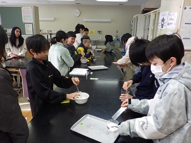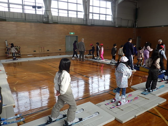 明日から築山でのスキー学習が始まります。低学年は、体育館でマットを敷き、スキーの脱着、歩きなどの練習をしました。