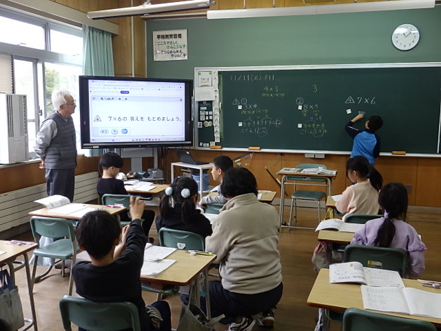 2年生は、かけ算の学習でした。自分なりの考えをみんなに伝えていました。7×6は、7を6回足すから・・
