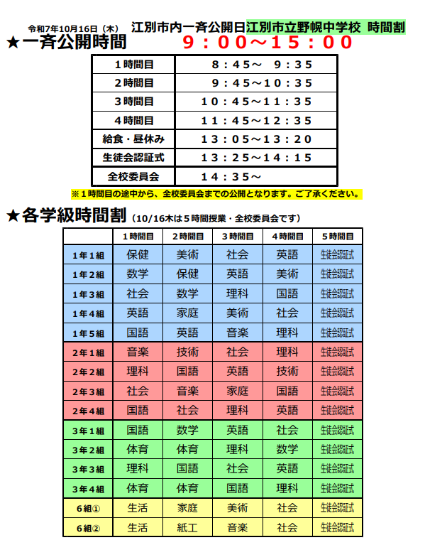 9時から15時の公開となっております。時間割を掲載しておきますので、ご希望の時間帯にお越しください。