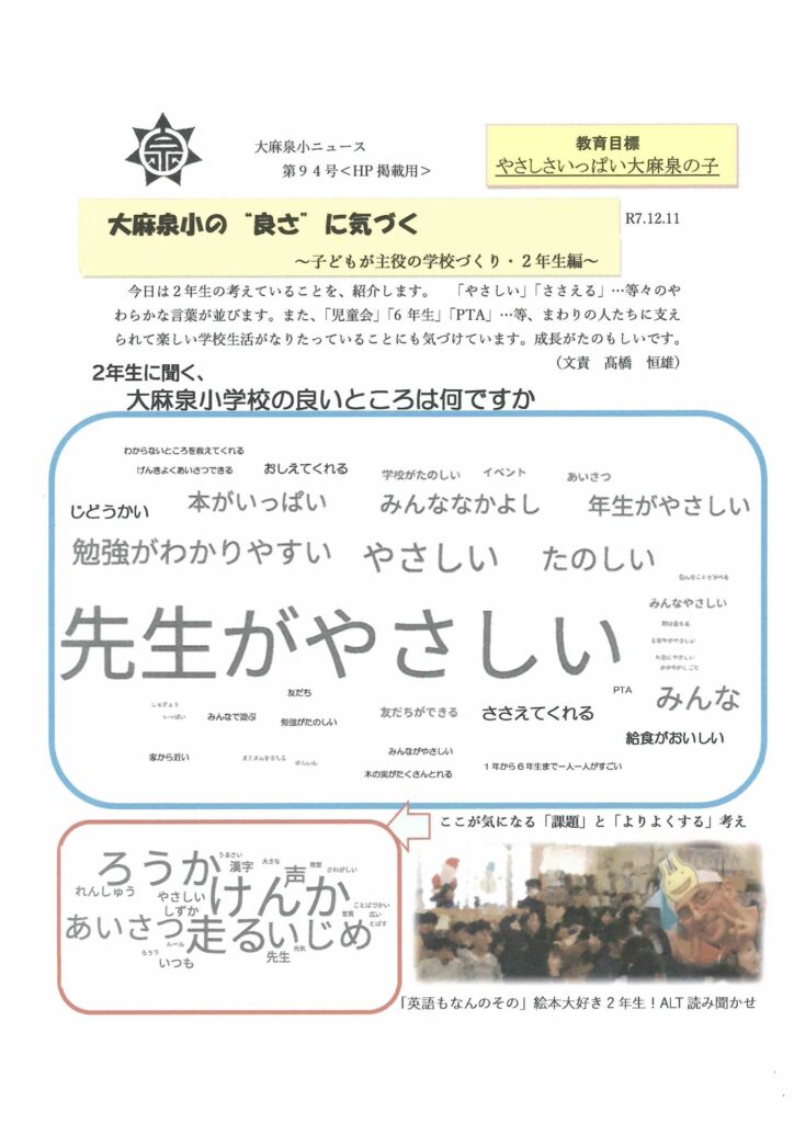 大麻泉小の“良さ”に気づく 投稿日時: 2025年12月11日 投稿者: o-izumi-s ~子どもが主役の学校づくり・2年生編~ 大麻泉小ニュース第94号をお届けします。 Post Views: 8