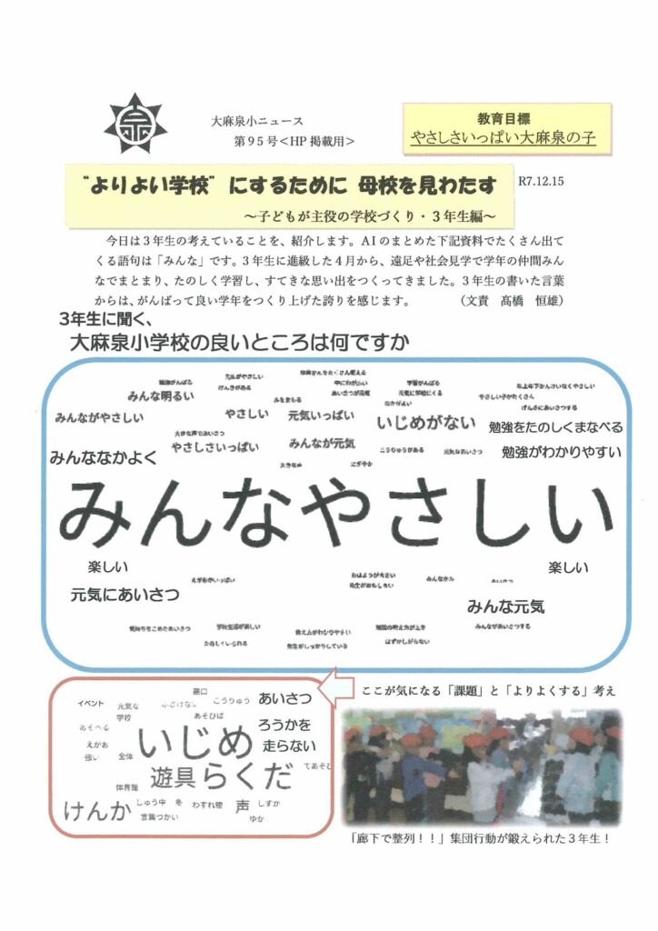 “よりよい学校”にするために母校を見わたす 投稿日時: 2025年12月15日 投稿者: o-izumi-s ~子どもが主役の学校づくり・3年生編~ 大麻泉小ニュース第95号をお届けします。 Post Views: 5