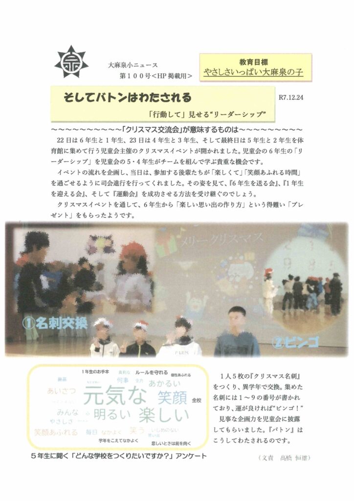 そしてバトンはわたされる 投稿日時: 2025年12月24日 投稿者: o-izumi-s 「行動して」見せる“リーダーシップ” 大麻泉小ニュース第100号をお届けします。 Post Views: 31