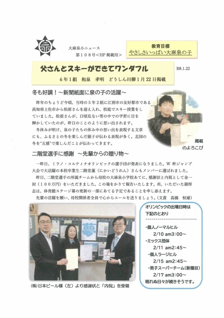 父さんとスキーができてワンダフル 投稿日時: 2026年1月22日 投稿者: o-izumi-s 二階堂選手に感謝~先輩からの贈り物~ 大麻泉小ニュース第108号をお届けします。 Post Views: 6