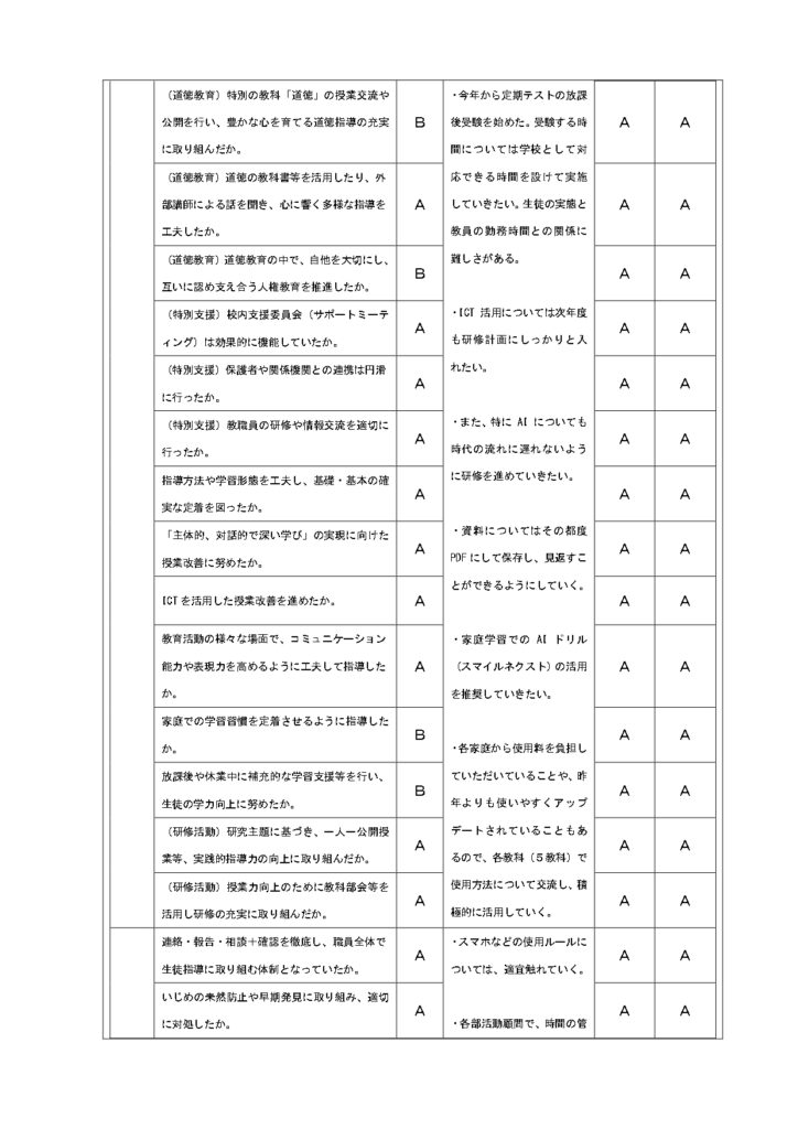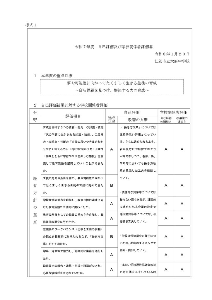 カテゴリー 一般 令和7年度自己評価及び学校関係者評価書 投稿者 作成者: oasa-t 投稿日 2026年1月23日 令和7年度の自己評価結果に対する学校関係者評価を掲載しましたのでご確認ください。 Post Views: 19 ← 第3回学校運営委員会開催の報告 → 学校だより更新