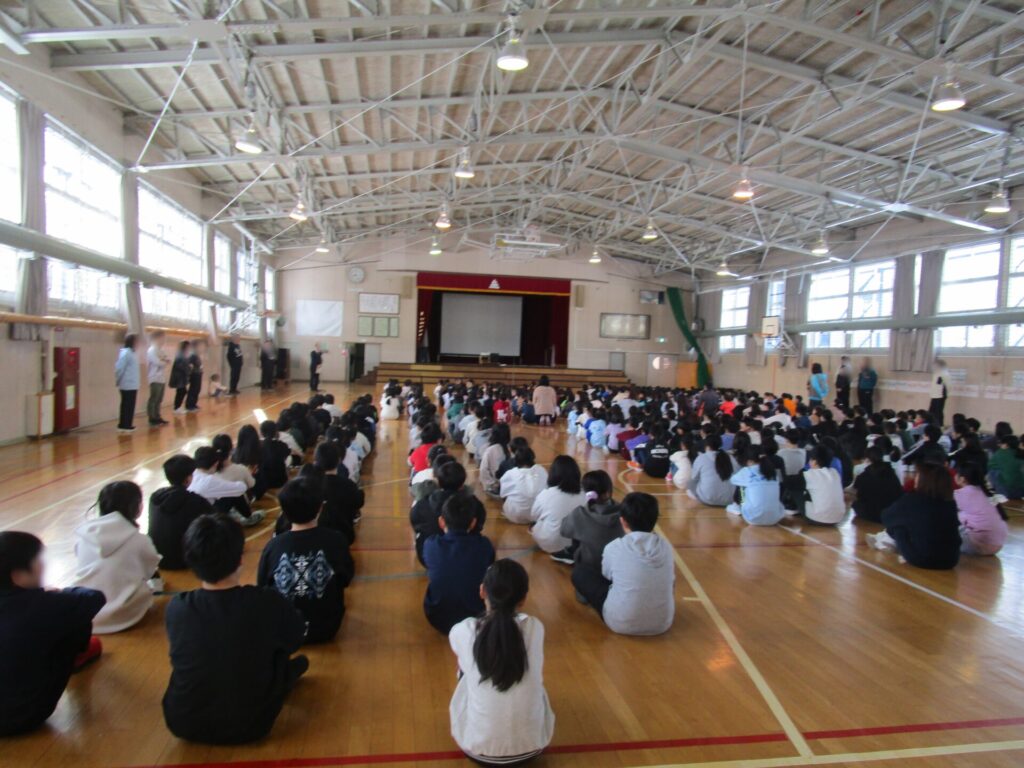 最初にみんなで「輝く未来」を歌ってから、児童会書記局の3名からいじめや人間関係を考える絵本の紹介がありました。どの本もいじめはよくない!というメッセージが伝わる内容でした。冬休み明けに図書室の掲示板で「いじめを考える」コーナーが作られ、今回紹介された本も展示されるとのことなので、たくさんの児童の皆さんに読んでもらえると思います。