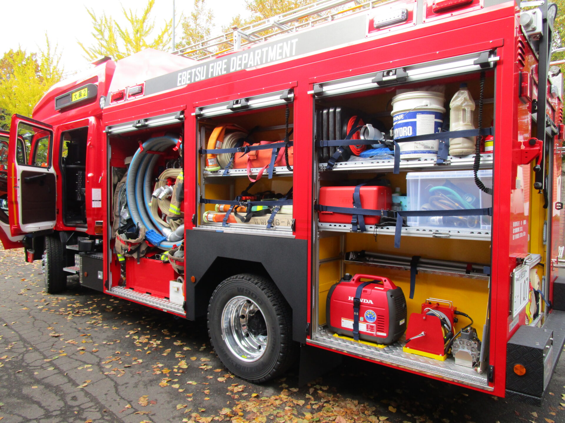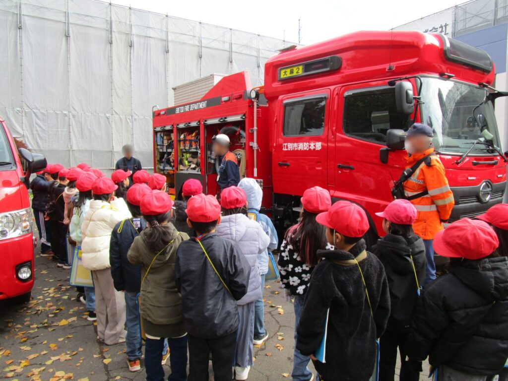 消防の仕事がどのようなものかを学んだほか、普段近づくことのできない消防車を間近で見せてもらい、実際に消防士さんの服やヘルメットを着用させてもらうこともできました。