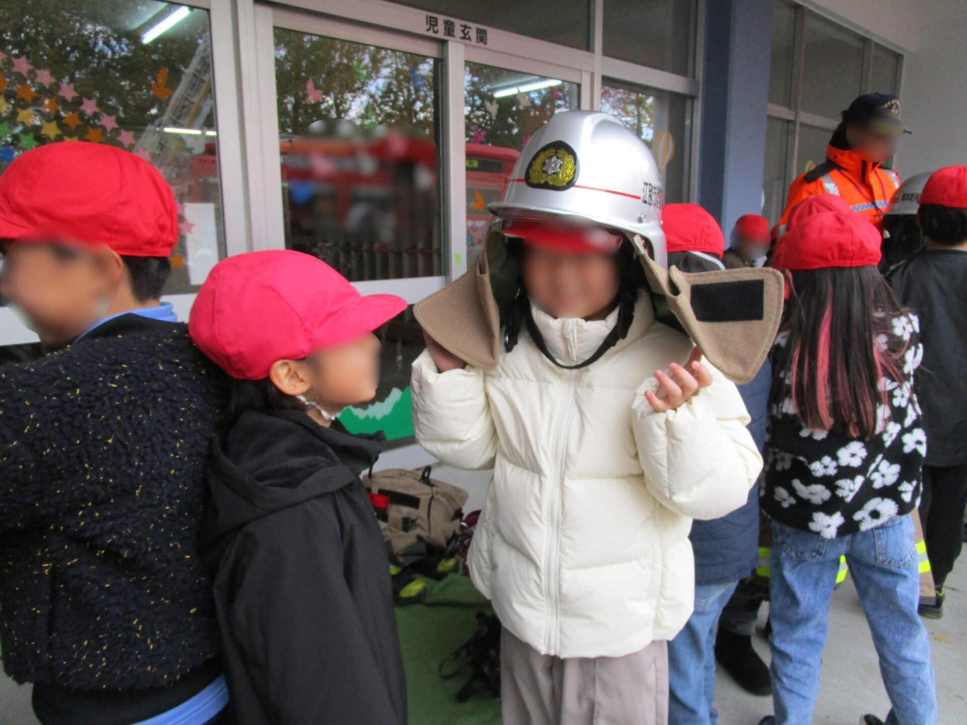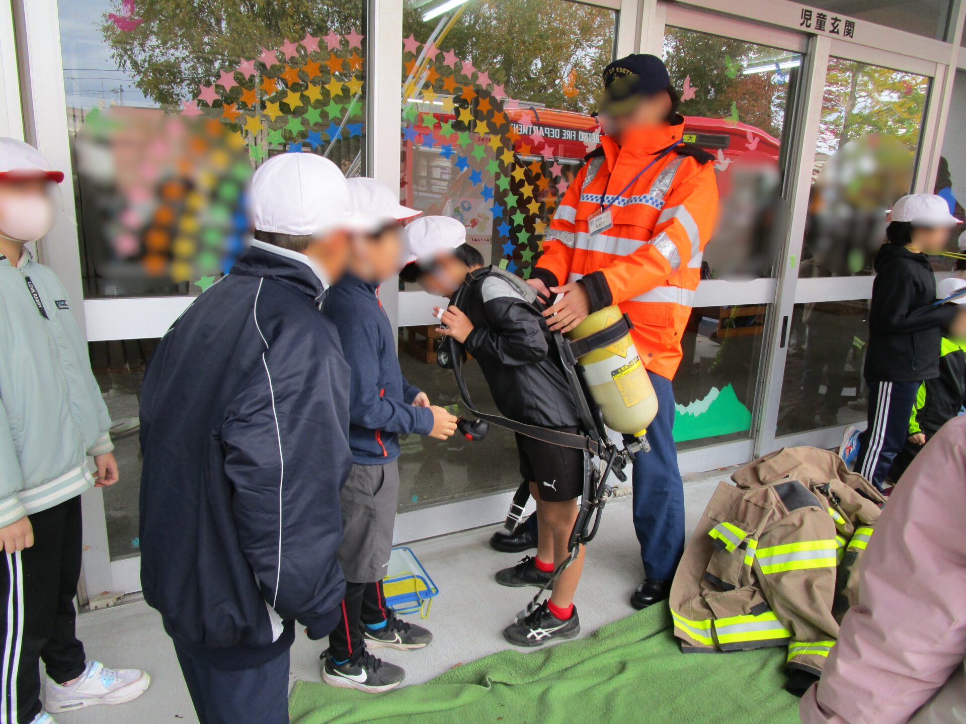 子どもたちは初めて見る本物の消防用具に目を輝かせながら、積極的に質問をしていました。