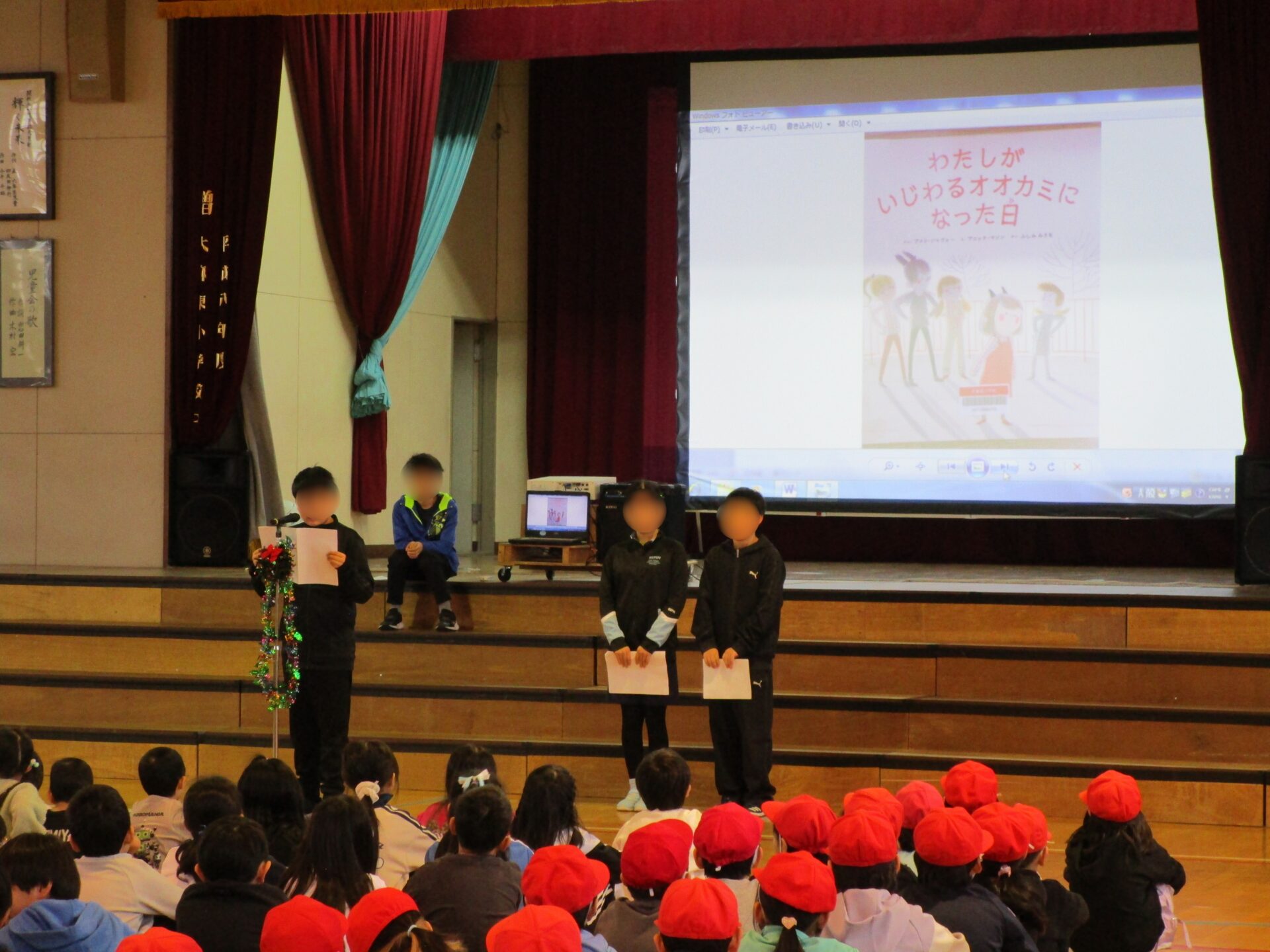 最初にみんなで「輝く未来」を歌ってから、児童会書記局の3名からいじめや人間関係を考える絵本の紹介がありました。どの本もいじめはよくない!というメッセージが伝わる内容でした。冬休み明けに図書室の掲示板で「いじめを考える」コーナーが作られ、今回紹介された本も展示されるとのことなので、たくさんの児童の皆さんに読んでもらえると思います。