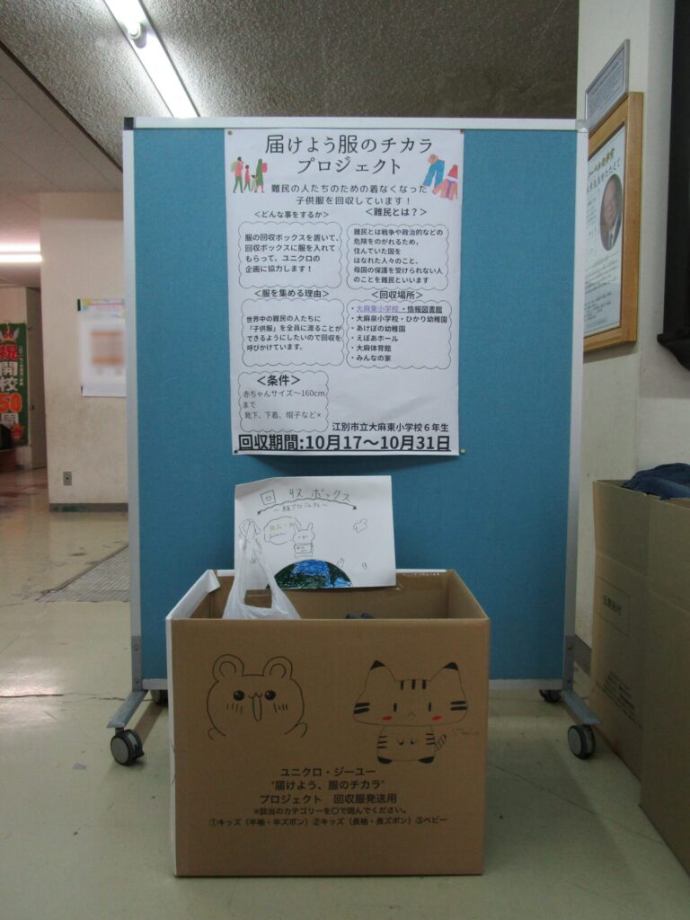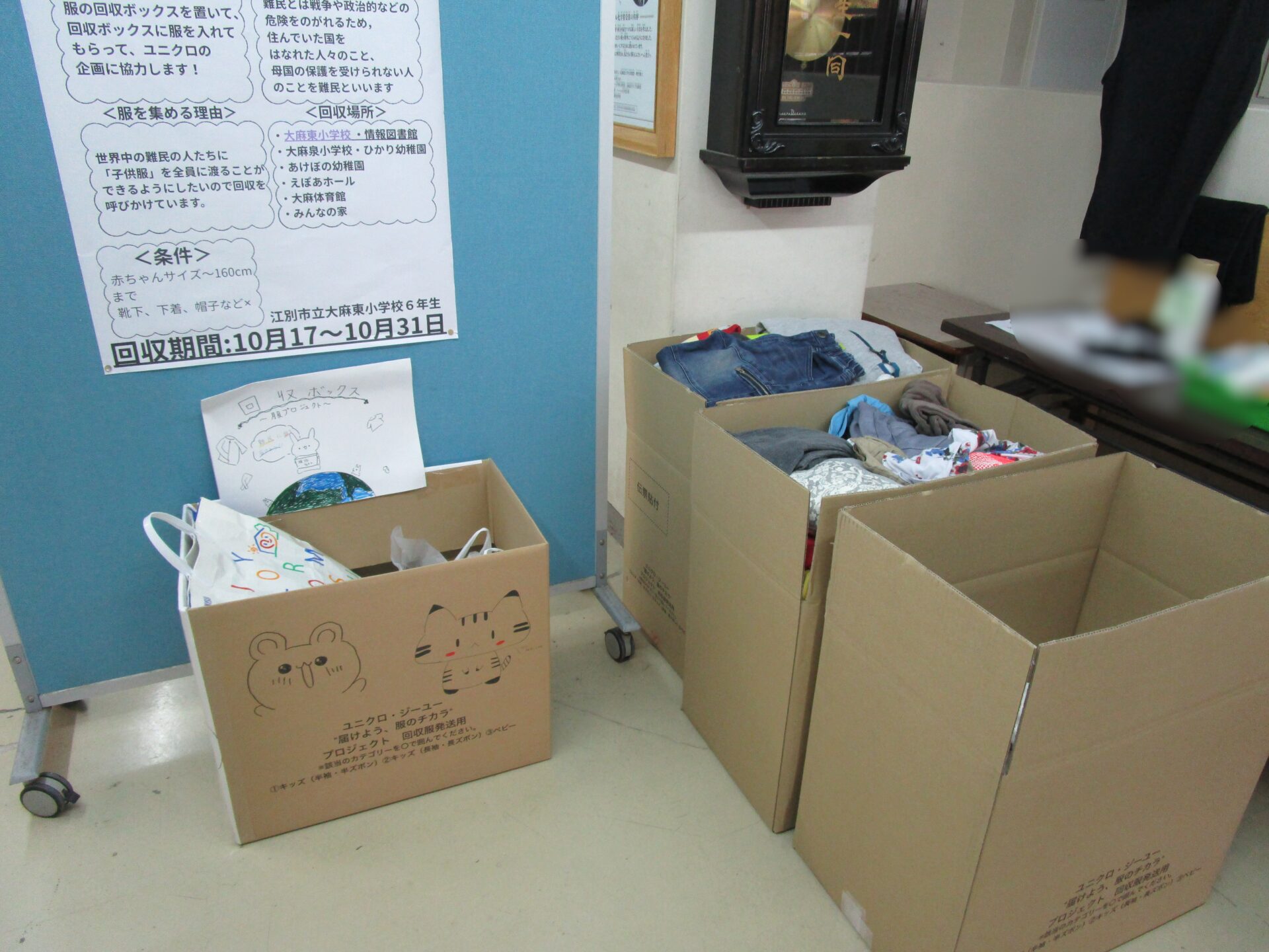 6月にユニクロ本部の方から、服の持つチカラやリサイクルについて学んだことを受けて、6年生が中心となり、10月17日(金)から子供服の回収活動が始まりました。