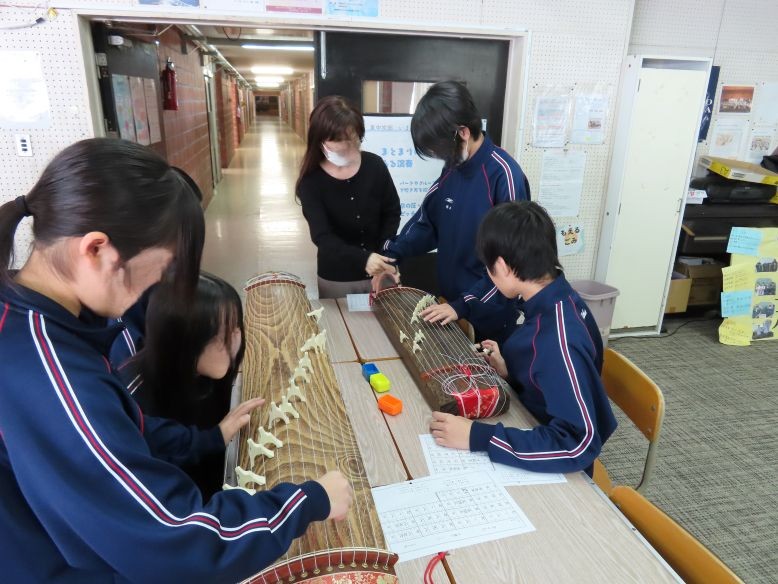1年生音楽の授業で、地域の方を外部講師に招き「箏の授業」を行いました。日本の伝統的な和楽器ですが、普段は目にしたり、触れたりすることが少ない「箏」。その歴史、構造、奏法を学び、講師の先生に丁寧に教えていただきながら「さくら さくら」の演奏に挑戦しました。初めての箏の演奏は1年生にとって貴重な体験となりました。