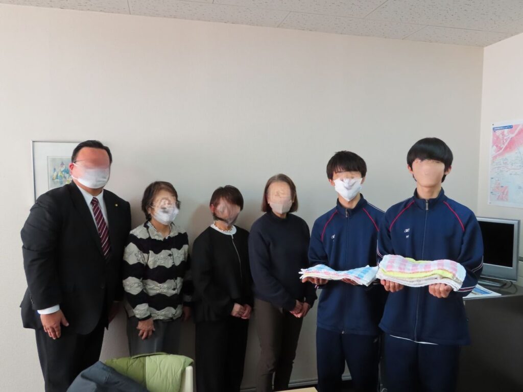 大麻地区で毎年、小中学校のために手縫い雑巾を寄贈してくださっている「ひまわり会」の皆さんから本校に雑巾を寄贈していただきました。受け取った代表生徒からは「いただいた雑巾は大切に、学校のために有効に使わせていただきます。ありがとうございました。」とお礼の言葉が述べられました。