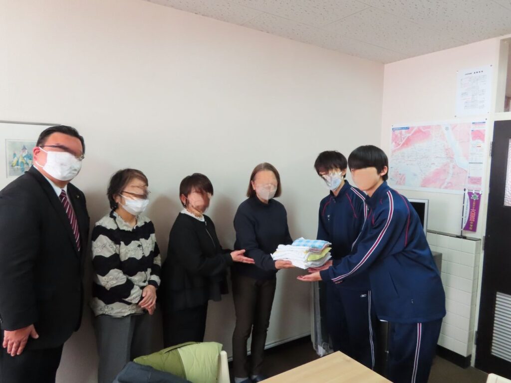 大麻地区で毎年、小中学校のために手縫い雑巾を寄贈してくださっている「ひまわり会」の皆さんから本校に雑巾を寄贈していただきました。受け取った代表生徒からは「いただいた雑巾は大切に、学校のために有効に使わせていただきます。ありがとうございました。」とお礼の言葉が述べられました。