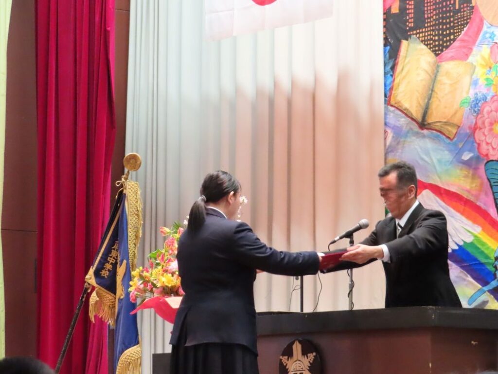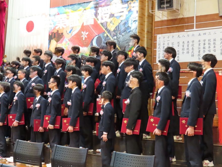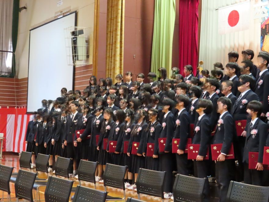 3/13(金)、103名の卒業生が中学校3年間の課程を終え、大麻東中学校を卒業しました。卒業おめでとう!卒業生一人ひとりが、凛と背筋を伸ばして校長の目を見ながら卒業証書を受け取り、圧巻の歌声を残して胸を張って堂々と式場をあとにする姿には、これまでの大きな成長とこれからへの期待が感じられました。そして、最後は、在校生(1,2年生)、保護者、教職員に見送られ、笑顔で中学校生活を終えました。4月からは、新たな環境で充実した生活を送ってほしいと思います。機会があれば、「頑張って高校生をやっている」姿とより成長した姿を見せに、ぜひ大麻東中学校を訪れてほしいものです。これからも皆さんを応援しています!