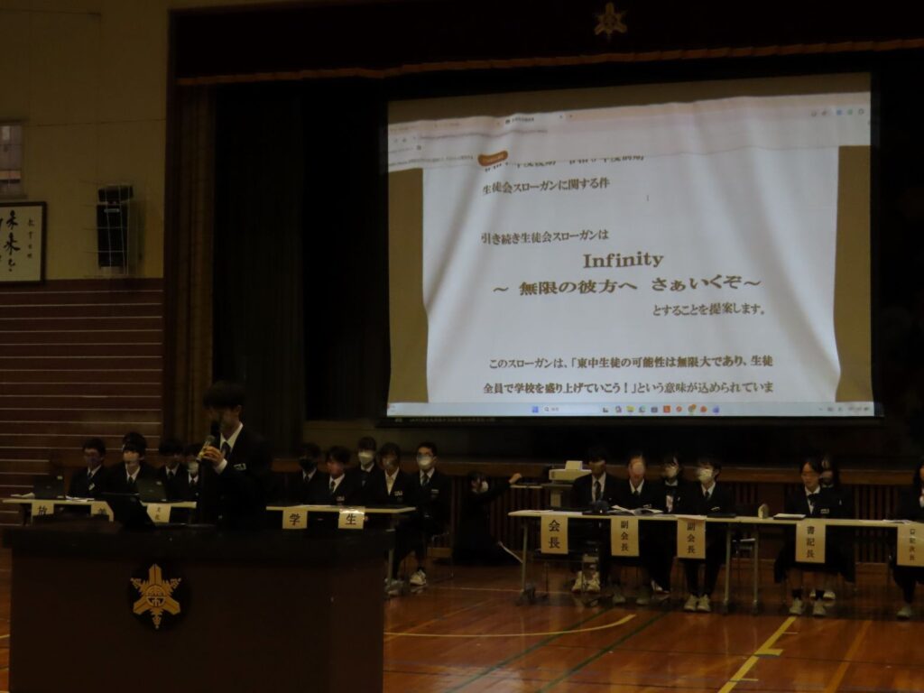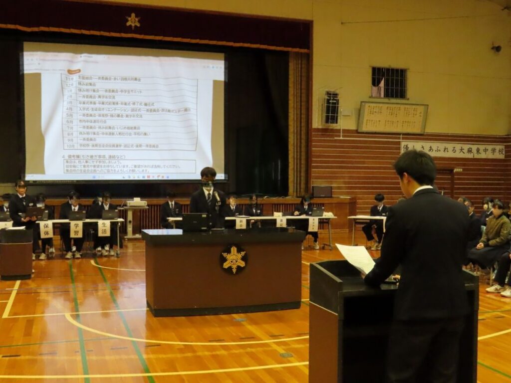 11/18(火)に生徒総会を行いました。生徒会書記局と各委員長から前期の活動報告と今後の活動計画が提案され、全校生徒で学校生活をより良くする意見を出し合いました。旧生徒会役員の皆さんは、これまで学校の中心として様々な活動を支えてくれました。また、新しく選ばれた生徒会役員の皆さんには、これからの学校づくりを支えるリーダーとしての活躍が期待されます。全校生徒と協力し、さらに活気があり、みんなが安心して過ごせる学校をつくってくれることを楽しみにしています。