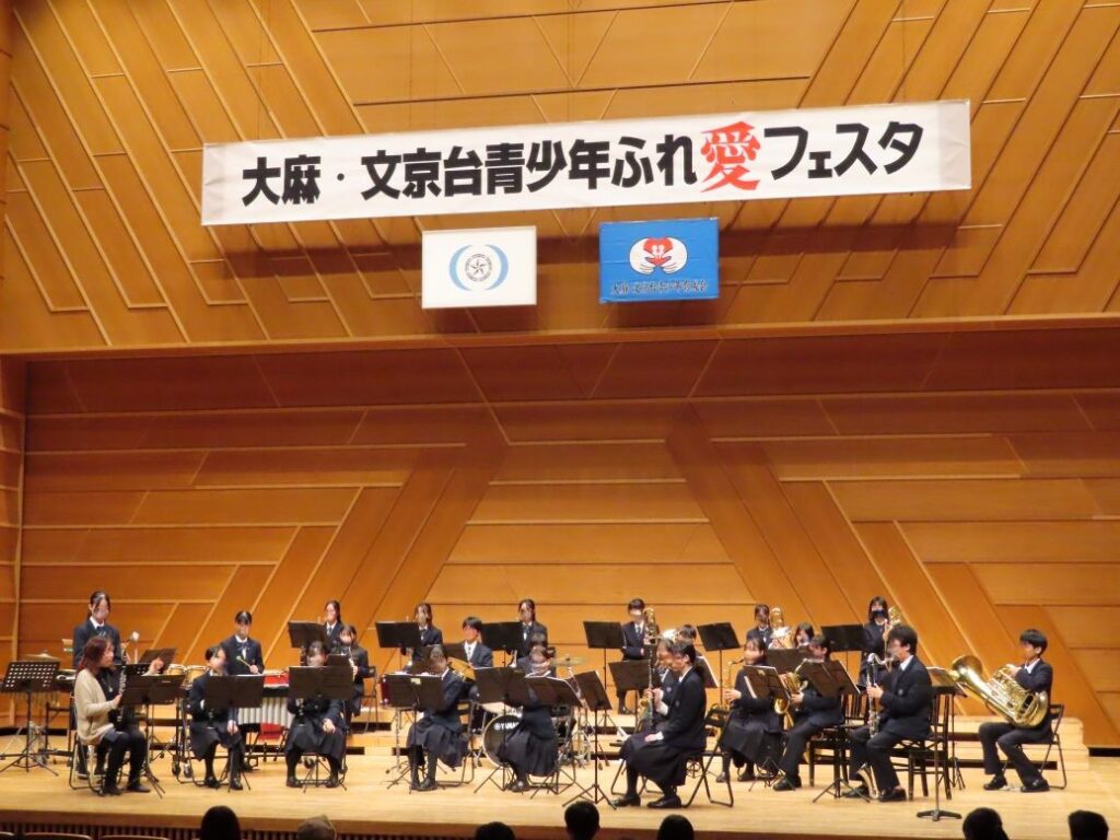 11/23(日)に開催された「大麻・文京台 青少年ふれ愛フェスタ」に、学校代表に選ばれた本校1年生1名が作文発表を行いましたた。その後、吹奏楽部が合計6曲を演奏しました。