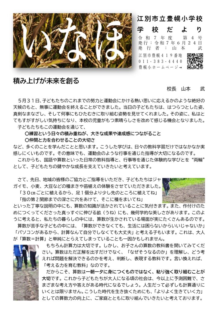 緑広がる大地の中で 夢を抱き 未来を拓く 豊幌っ子 ○かんがえる子 ○たすけあう子 ○たくましい子