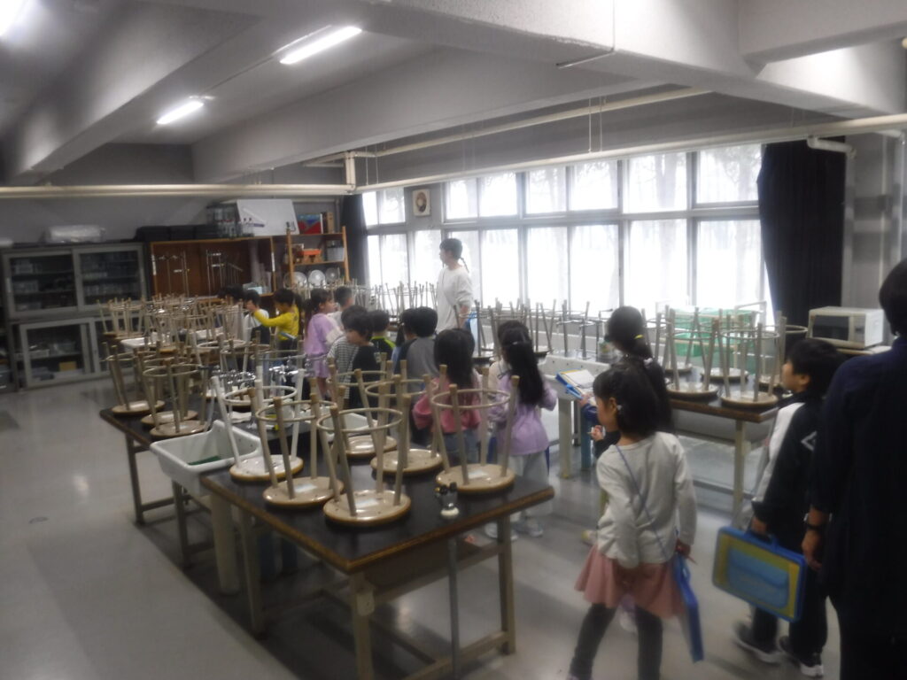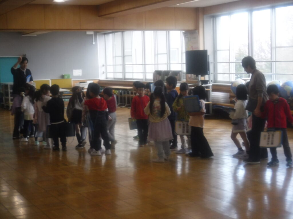 1年生が担任の先生と一緒に校内を歩き、特別教室などの場所を確かめたり、室内の様子を少しだけ見学したりしました。対雁小の一員として、少しずつ学校のことに詳しくなってきています。