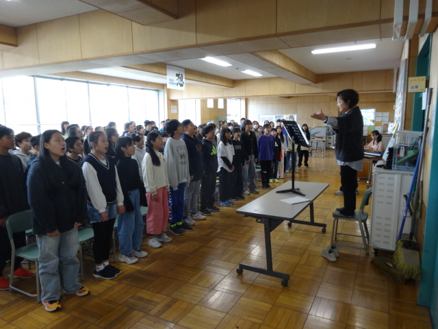 江別太小学校阿部先生をゲストティーチャーに招いて、6年生の合唱指導が行われました。6年生の「一生懸命歌おうとしている姿勢」や「学年全体の一体感」をとてもほめていただきました。歌詞の一つ一つをどのように歌えばよいのか、口の開け方や発音の仕方などを細かく指導していただきました。これからあと約1週間、6年生の合唱のレベルアップがとても楽しみです。