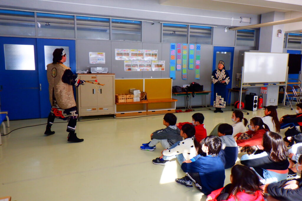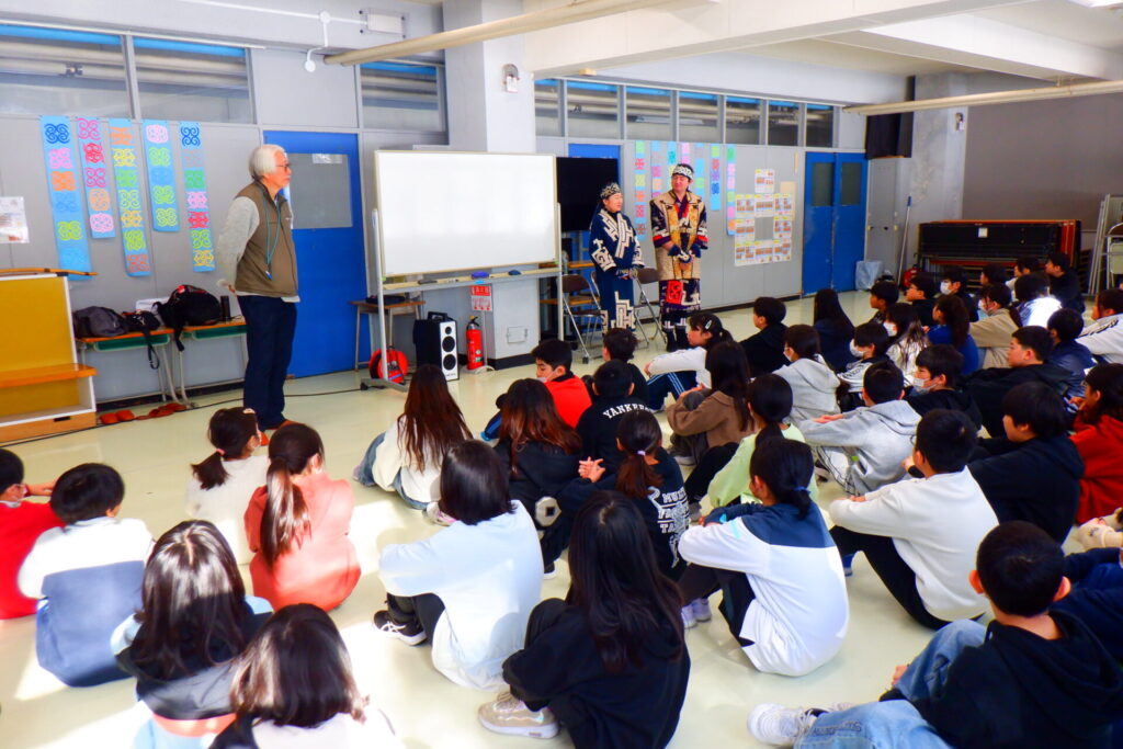 ゲストティーチャーをお招きし、アイヌ文化についての学習を行いました。 授業では、古くから伝わるアイヌ民話の一部を、演劇を交えながら分かりやすく語ってくださいました。子どもたちは、まるでお話の世界に引き込まれるかのように、目を輝かせて聞き入っていました。 後半は、全員で輪になってアイヌ文化の歌を歌いました。手拍子や掛け声を交えながら、楽しく歌い踊る姿が印象的でした。教科書には載っていない貴重なお話もたくさん伺うことができ、非常に有意義な時間となりました。