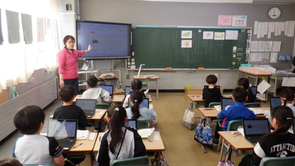 「自分の好きなことをしている時はどんな気持ちかな?」「自分の良いところはどこだろう?」と、自分自身についてじっくりと考えました。考えた内容は、タブレットの協働学習ツールを使ってクラスのみんなで共有。1年生も入学から時間が経ち、文章を書くことやタブレットの操作にずいぶんと慣れ、スムーズに学習を進められるようになっています。