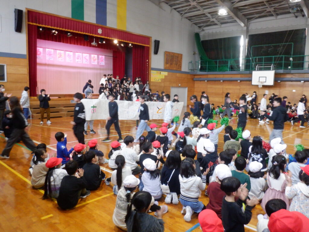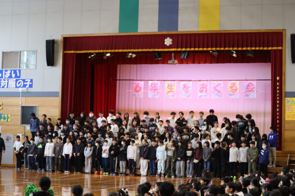 3・4時間目に「6年生を送る会」が開催されました。1〜5年生は、これまでお世話になった6年生へ感謝の気持ちを込めて、趣向を凝らした発表を行いました。6年生と一緒にゲームやクイズを楽しみ、会場は大盛り上がり。最後には、6年生が卒業式で歌う合唱曲『旅立ちの日に』を披露しました。さすが6年生という圧巻の歌声に、会場全体が大きな感動に包まれました。お互いの感謝の気持ちが通じ合う、素晴らしい会となりました。