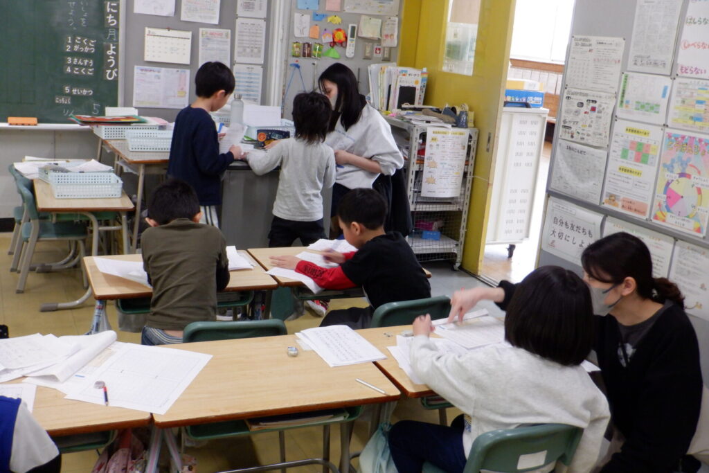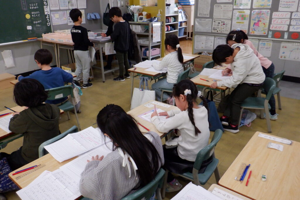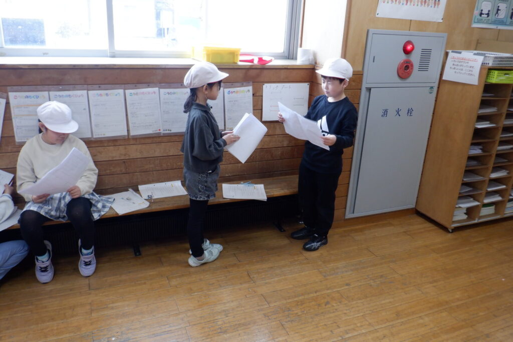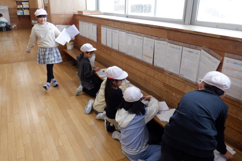 各教科の学習もまとめの段階に入りました。 1年生の国語では、後期のめあてを振り返り、「自分が頑張ったこと」や「2年生で頑張りたいこと」を作文にまとめる学習に取り組んでいます。先生に添削してもらいながら、会話文の書き方や段落の分け方もあわせて学んでいます。書き上げた作文を友達に読み聞かせる姿も見られました。課題に一生懸命向き合う姿に、大きな成長を感じます。